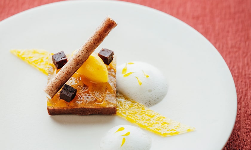 メインデザートは、金柑、ハッサク、コアントロー(オレンジリキュール)などの柑橘類とショコラを味わう、テリーヌ・ド・ショコラ。ひと口ごとに柑橘の芳醇な香りが広がり、ショコラの深い味わいを引き立たせます。