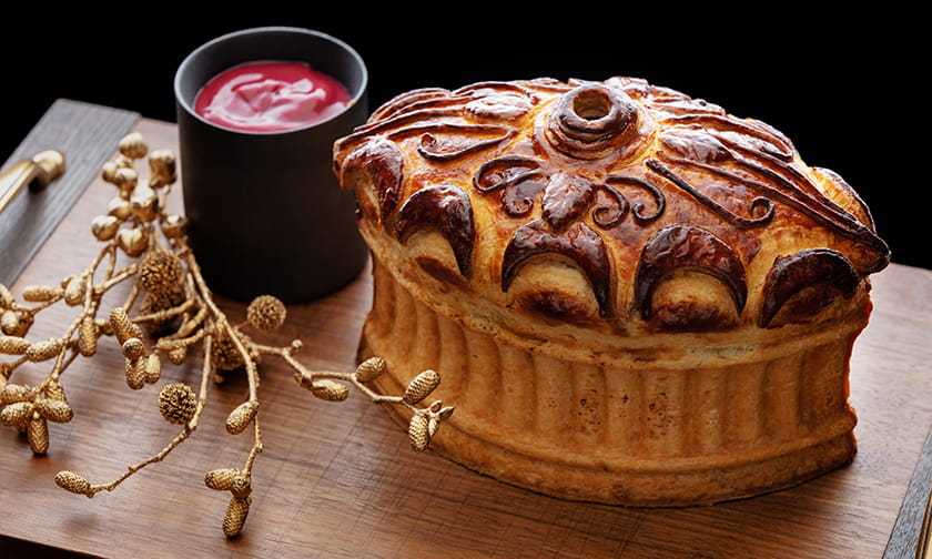 王冠を象った特製の金型で焼き上げたパイは、ゲストの前で切り分けられます。幾何学的に重なり合う断面はまさに芸術的。食感と旨味のグラデーションを楽しめます。