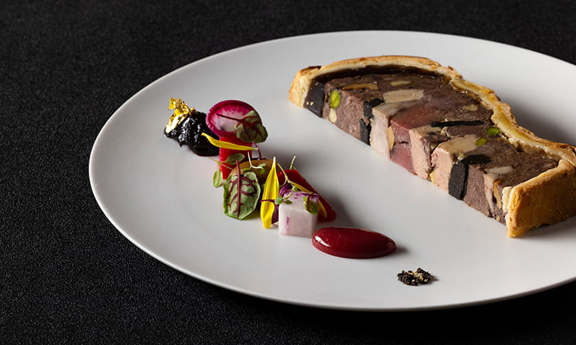 鹿や猪、山鳩など4種以上のジビエにトリュフやフォアグラを幾層にも重ね、パイで包み焼き上げた前菜「パテ・ド・ロワ」。