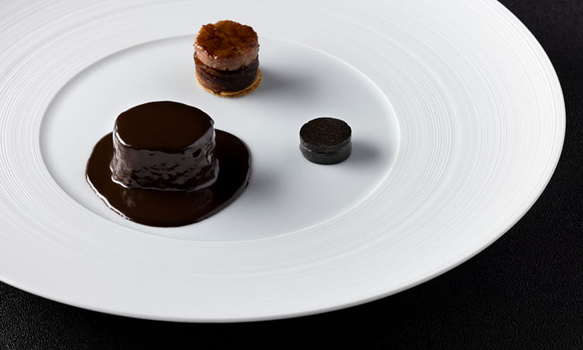 メインの「ジビエ・ア・ラ・ロワイヤル」は、穴熊、鹿、雉など多種のジビエの旨味を凝縮した贅沢な料理です。数日間じっくりと煮込み、野性味を格調高くまろやかなに仕立てました。約一週間かけて作る深淵なソースが、さらに味わいに奥行きを与えています。