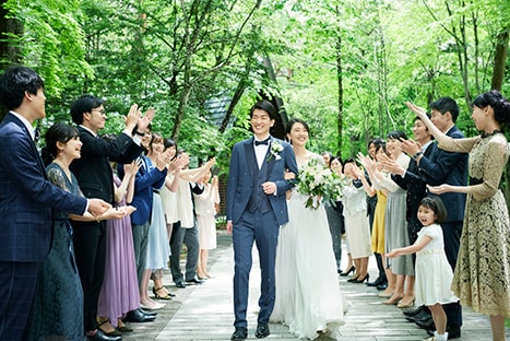 挙式のあとは、中庭でのライスシャワーでゲストからのあたたかな祝福がふりりそそぎます。
