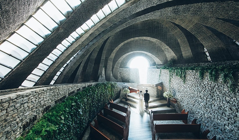 あたかも軽井沢の自然の中に身を置くような堂内は、凛とした空気に満ちています。石とガラスが折り重なるアーチからやわらかい光が降り注ぎ、おふたりを祝福します。厳かな静寂の中で誓うセレモニーは、おふたりとみなさまの心に深く刻まれます。