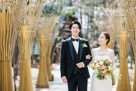 3月の軽井沢は、高い晴天率に恵まれ、どこまでも澄み切った青空が広がります。 教会の森では、端正な造形のオブジェが自然と調和しながら静かに並びます。その視線の先に現れるのは、美しい曲線を活かした優美なウッドウォール。 このウッドウォールを背景に撮る一枚は、まるで洗練されたアート作品のようなフォトジェニックな仕上がりになります。